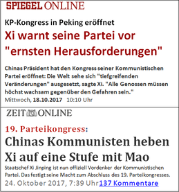 “Xi mette sull’avviso il suo partito di fronte a ‘sfide serie.” titola Der Spiegel il 18 ottobre. “…Mentre gli Usa si chiudono dietro la politica ‘America First’ del presidente Trump, Xi si è presentato come difensore della globalizzazione”prosegue il giornale. Precisa poi il quotidiano “Die Zeit” il 24 ott.:“Per la realizzazione del ‘Sogno cinese’ [Xi Jinping] mira ad una Cina forte sul piano economico e militare con un ruolo potente nel mondo”. Per ottenere questo, prosegue Die Zeit“… come previsto, il partito ha deliberato nel Rapporto della Commissione di Disciplina la sua lotta contro la corruzione, molto popolare tra la gente. Con questa misura Xi Jinping procede non solo contro la corruzione nel partito, ma anche contro i rivali, assicurandosi così la lealtà”.