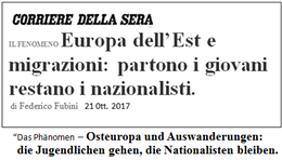Federico Fubini nel suo articolo “Europa dell’Est e migrazioni: partono i giovani restano i nazionalisti” spiega che in questo periodo “la Bulgaria ha perso il 21% della popolazione, l’Ungheria circa il dieci per cento, la Lituania il 24%, la Lettonia un terzo degli abitanti e l’Estonia oltre un sesto. Lungo la dorsale che corre dal Mar Baltico all’Adriatico oggi esistono sette milioni di persone in meno rispetto al giorno del 1991 in cui Boris Eltsin sancì la disintegrazione dell’Unione Sovietica (...) L’Europa di mezzo, un territorio di poco più di cento milioni di abitanti, ha visto emigrare verso le regioni ricche della Ue oltre 20 milioni dei suoi figli. Il Fmi stima che fino al 2012 quasi la metà di questi migranti si sia recata in Germania (...) Nazioni come la stessa Bulgaria o le orgogliose repubbliche baltiche, quelle che per prime sfidarono Mosca, oggi si dibattono in una crisi non più solo demografica. È fiscale, perché diventa impossibile finanziare le pensioni quando si perde un terzo della forza-lavoro. Ed è esistenziale, perché una certa opinione pubblica vede il proprio popolo minacciato di estinzione in un’Unione Europea di quasi mezzo miliardo di persone.”