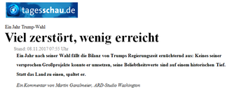 Martin Ganslmeier l’8 nov. sul Tagesschau attacca il presidente americano Trump:“Le uniche linee fin qui riconoscibili sono ‘l’America per prima!‘ e ‘Via dall’eredità di Obama!’. Tutto quello che Obama aveva costruito Trump lo abbatte, indifferentemente se è ’L’accordo di Parigi sul Clima’, o ‘L’accordo sul nucleare con l’Iran’, o il ‘Programma per la protezione dei bambini degli immigrati illegali”. Non sono solo i grandi agglomerati finanzial-industriali americani che continuano nell’attacco a Trump suoi loro grandi mezzi di informazione e non lo tollerano come guida al governo americano (il loro governo) nonostante lui stesso sia un grande impresario e possegga patrimoni ingenti, ma anche la stampa europea lo disapprova costantemente. E’ la politica estera che persegue che non trova il loro consenso. Prosegue Ganslmeier: “In politica estera Trump non ha una chiara strategia. In Asia lascia la Cina andare avanti. Vuole rigettare il NAFTA (l’Accordo Nordamericano di Libero Scambio) se il Canada e il Messico non si piegano alle sue condizioni. L’Europa è più fortunata. I consiglieri di buonsenso che stanno dietro a Trump gli hanno detto chiaramente come la NATO sia importante. Trump d’istinto è meno legato all’Accordo Transatlantico e ancor meno all’Unione Europea. E il rapporto con la Russia, diversamente da come Putin auspicava, è peggio che mai, visto che l’inchiesta Mueller fa ombra sulla Casa Bianca” Ripetutamente, Trump viene considerato dai vertici capitalisti un non esperto, un populista, imprevedibile e non consono per i loro interessi strategici internazionali. In altre parole Trump fa perdere loro soldi. L’attacco contro di lui perpetrato da i loro enormi media, tv e giornali è perciò continuo, implacabile, mettendolo in cattiva luce su qualsiasi cosa egli dica o faccia. E’ questo il tratto caratteristico che imprime oggigiorno il ciclo politico americano con questo presidente, non altro.