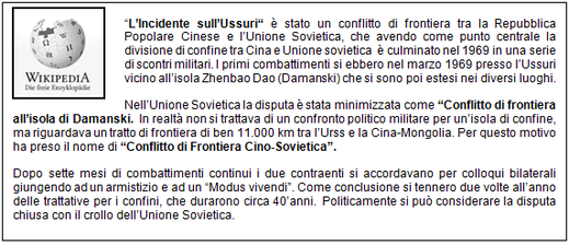 I giornali dell’epoca riportano che il motivo dello scontro armato tra le due nazioni erano i territori limitrofi al nord della Cina, contesi ancora dall’800 quando i due paesi ancora erano medioevali. Così descrive la situazione Wikipedia in “Zwischenfall am Ussuri“ (Incidente sull’Ussuri)