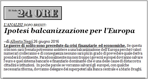 Die Tageszeitung “Il Sole 24 ore” hingegen sieht in ihrer Analyse nach dem Brexit im Artikel “Hypothese der Balkanisierung Europas” den Austritt Großbritanniens aus der Europäischen Union als den möglichen Beginn eines wirtschaftlichen Desasters, das in einen Krieg münden könnte. Der Artikel beginnt wie folgt: “Kriegen gehen normalerweise finanzielle oder wirtschaftliche Krisen voraus”. Dies ist eine exquisite marxistische Feststellung, die man in einer Zeitung des Unternehmertums absolut nicht zu lesen erwartet, denn die am häufigsten in den bürgerlichen Medien vertretene These über die Ursachen der Kriege ist, dass böse und blutrünstige menschliche Feinde (die Freunde sind statt dessen immer gut) den Verstand verlieren und die Kriege anzetteln, wie zum Beispiel al-Kaida, der IS, Hitler, Saddam Hussein, Pol Pot, Assad, Putin, usw.