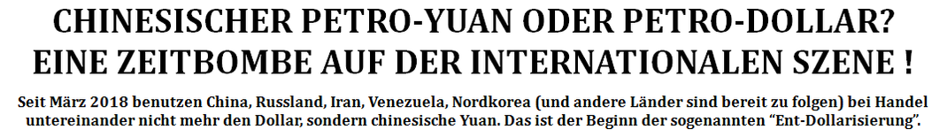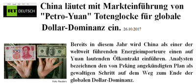 Am Ende des Artikels wird Putin zitiert, der nach dem BRICS-Gipfel im September in Xiamen in China die Petro-Yuan Operation voll unterstützte: “Russland teilt die Besorgnis der BRICS-Länder über die Ungerechtigkeit der globalen Finanz- und Wirtschaftsarchitektur, die dem wachsenden Gewicht der Schwellenländer nicht angemessen Rechnung trägt. Wir sind bereit, mit unseren Partnern zusammenzuarbeiten, um internationale Reformen bei der Regulierung im Finanzbereich voranzutreiben und eine übermäßige Dominanz der begrenzten Zahl an Reservewährungen zu überwinden". Mit anderen Worten meint Putin, dass der Moment gekommen sei, an dem die aufstrebenden Länder (China, Indien, Russland, usw.) bei den wirtschaftlichen Transaktionen untereinander den Dollar durch die eigene Währung ersetzen.