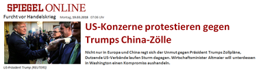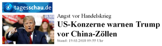 Aber die amerikanischen Großunternehmen und Großbanken behaupten mit Trumps Initiative nicht einverstanden zu sein. “Die multinationalen Unternehmern der Vereinigten Staaten warnen Trump vor China-Zöllen” schreibt die “Tagesschau” am 19.März auf der offiziellen Webseite des staatlichen Fernsehsenders. “Der Spiegel”, die größte deutsche Zeitschrift, fügt am gleichen Tag hinzu: ”Die multinationalen Unternehmen Amerikas protestieren gegen Trumps China-Zölle”. Die großen Industriegruppen in den USA sehen in Trumps Entscheidung die Eröffnung eines enormen protektionistischen Wirtschaftskrieges gegen den chinesischen Imperialismus, der ihnen deutlich schaden wird. Deshalb sind sie der Meinung, dass diese Art von Reaktion völlig falsch sei.