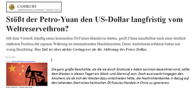 Der oben abgedruckte Artikel “China läutet mit der Markteinführung des ‘Petro-Yuan’ Totenglocke für globale Dollar-Dominanz ein” unterstreicht als erstes, dass mit der Einführung des Petro-Yuan der Sturz der Dominanz des US-Dollar begonnen hat, und legt dann den Akzent auf die Tatsache, dass die eigentliche Stärke der chinesischen Währung in ihrem Tauschwert zum Gold liegt. Wenn ein Land China Rohöl verkauft und dafür Yuan erhält, kann es diese Währung Yuan, falls gewünscht, praktisch in Gold umwandeln. Dies verleiht dem Yuan ein beachtenswertes Gewicht, denn falls eine Geschäftsmann sich gegen Währungsspekulation absichern will, kann er dies tun, indem er an der Börse in Hong Kong und Shanghai Gold ankauft, denn die chinesischen Banken sind voll davon.