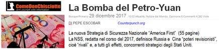 “Alle MENA-Völker (Mittlerer Orient - Nordafrika) haben verstanden, was passiert ist, als Saddam Husseins Irak entschied Erdöl gegen Euro zu verkaufen, oder als Muammar al-Gaddafi plante, einen pan-afrikanischen Golddinar einzuführen”. Pepe Escobar “LA BOMBA DEL PETRO-YUAN” (in comedonchisciotte.org) 29. Dez. 2017 |