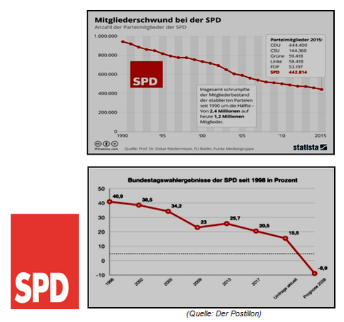 Von den 40% der potenziellen Wähler im Februar 2017, erhält die SPD bei den Wahlen im September nur noch 20%, absoluter Tiefpunkt. Beklemmung macht sich in der gesamten Parteistruktur breit. Aber trotz der katastrophalen Wahlniederlage akzeptiert die Direktion in eine Neuauflage der Großen Regierungskoalition unter der Leitung Merkel einzutreten. Das löst Chaos aus in der Partei. Anklagen und Gegenanklagen wer an der Niederlage Schuld ist verleiten den “Helden” Schulz dazu zurückzutreten, während die JUSOS sich eisern gegen eine Beteiligung der Partei an der Regierung wehren. In der Zwischenzeit verzeichnen die Umfragen einen weiteren eklatanten Abfall: die neuesten positionieren die SPD zwischen 17 und 15%.
