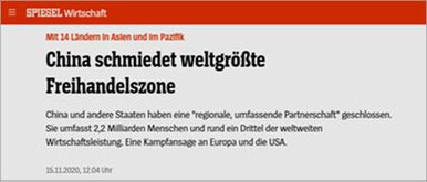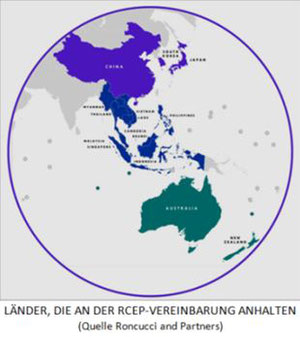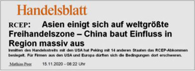 Und tatsächlich wurde im November diesen Jahres in Hanoi (Vietnam) des Regional Comprehensive Economic Partnership (RCEP) unterzeichnet. Ein Freihandelsabkommen zwischen 15 Nationen Asiens und des Pazifiks, das ein Drittel des weltweiten BIP und 2,2 Milliarden Menschen umfasst.