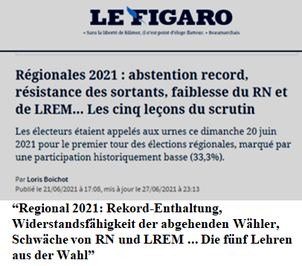 “Dreißig Millionen Einhaltungen, und ein paar Lektionen”… “Ist es ein Zeugnis der Gleichgültigkeit oder gar der Unzufriedenheit mit dem politischen Leben?“ … “Zwei von drei Französen (66,7%) haben an Sonntag nicht gewählt. Noch nie hat eine Wahl unter der Fünften Republik so weniger Wähler mobilisiert“… “Besonders nicht mobilisiert waren laut einer Ifop-Fiducial Umfrage die unter 35 - Jährigen (82%) und die Arbeiterklasse (72%)“(LE FIGARO – 21.Juni 2021)