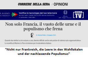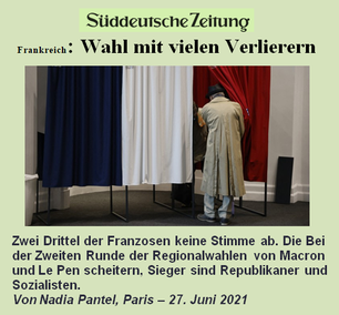 « Die Appelle der Politiker hatten sich die vergangene Woche über fast schon wie ein Flehen angehört, doch sie wurden nicht gehört. Auch bei der zweiten Runde der Regionalwahl gab die große Mehrheit der Franzosen nicht ihre Stimme ab. Die Zahl der Nichtwähler erreichte dabei die Rekordhöhe von 66 Prozent» … « So sprach Marlène Schiappa (Mitglied der Regierungspartei La République en Marche, beigeordnete Ministerin und erfolglose Kandidatin in der Region Île-de-France) von einer "großen Lektion in Demut", die die Ergebnisse in sich trügen»…« Jordan Bardella, Vizevorsitzender von Marine Le Pens rechtsextremen Rassemblement National (RN) (…) sagte, die geringe Wahlbeteiligung sei ein "Scheitern für die Gesamtheit der politischen Klasse".» (SüddeutscheZeitung – 27. Juni 2021)