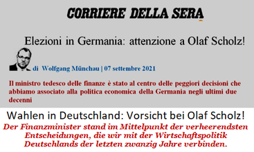 Im Artikel “Wahlen in Deutschland: Achtung vor Olaf Scholz!” vom 7.Sept. 2021 beginnt der “Corriere della Sera” die Vorstellung des abgebrühten Rechners Scholz für die Leserschaft wie folgt: “Olaf Scholz stand im Mittelpunkt der verheerendsten Entscheidungen, die wir mit der Wirtschaftspolitik Deutschlands der letzten zwanzig Jahre verbinden”. Dann wird erklärt: “Während der zweiten Regierung Schröder war Scholz zwischen 2002 und 2004 Generalsekretär der SPD und beauftragt, die Agenda 2010 bei der widerwilligen und feindseligen Basis anzubringen. Dabei handelte es sich um den Plan den Arbeitsmarkt und die Sozialfürsorge zu reformieren (…) [Die Agenda 2010 – A.d.R.] beschnitt die Langzeitarbeitslosenhilfe und führte eine Reihe von anderen Reformen ein, die den gemeinsamen Zweck hatten, die Lohnkosten in Deutschland zu senken (…) Daraufhin wurde Deutschland extrem konkurrenzfähig und man versuchte, die Staatsverschuldungskrise dem ungeregelten Finanzsystem zuzuschreiben. (…) Nun, Scholz trug dazu bei, diese Politik zu schmieden“.